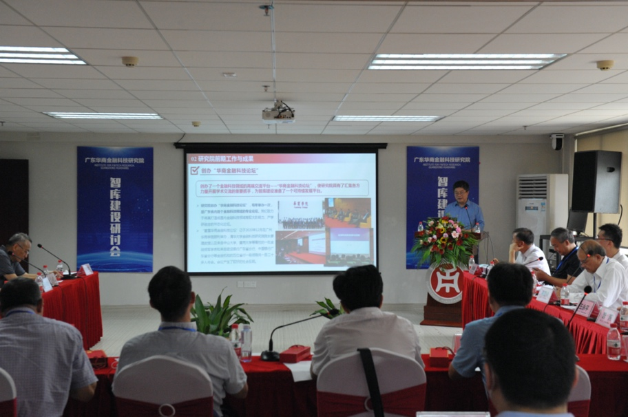 签约仪式之后,刘少波教授从智库建设的基本情况、前期工作和成果、智库建设基础与存在的主要问题、建设目标与思路、建设措施五方面向与会专家汇报了研究院的智库建设情况。他表示,研究院要力争成为金融科技领域省内一流、国内有影响力的研究智库。