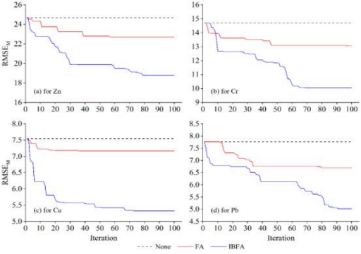 经过100轮进化迭代,IBFA从1512个原始波数中筛选出493个关键变量,显著降低模型复杂度,并有效提升预测性能。相比传统PLS模型,Zn、Cu预测R值提升至0.9以上,RMSE明显下降、收敛稳定性增强,IBFA证明了进化优化在分布式光谱数据筛选中的适用性。