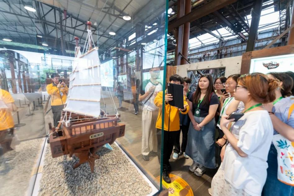 项目负责人围绕工业遗产活化的具体方案,详细解读建筑结构技术标准与功能空间改造的创新设计。在实地参观中,项目团队通过实物展示与互动体验相结合的方式,让师生们沉浸式感受工业遗产的创新魅力。在保留原貌的造船车间内,传统木工工具与现代数字投影技术交相辉映——投影生动还原从原料加工到船舶组装的传统造船工艺,历史与现代在此碰撞交融,加深了师生们对文化遗产创新利用的理解,也为师生们在文化创意、历史传承等领域的学习实践提供了鲜活范例。
