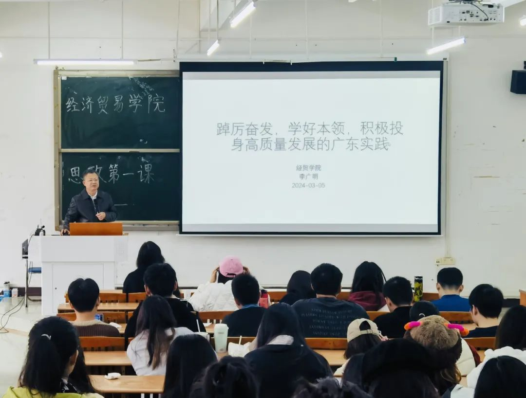2024年3月5日,经济贸易学院李广明院长在广州校区励志楼C402为经济贸易学院2021级学生讲授以“踔厉奋发,学好本领,积极投身高质量发展的广东实践”为主题的思政第一课。李广明院长以“人勤春来早”开篇,带领同学们学习全省高质量发展大会相关内容,引导同学们学习领会“以高质量发展推进中国式现代化”的深刻内涵。生产力是社会发展的最终决定力量,推进现代化建设最重要的是发展高度发达的生产力。习近平总书记强调发展新质生产力是推动高质量发展的内在要求和重要着力点。新质生产力的特点是创新,关键在质优,本质是先进生产力。