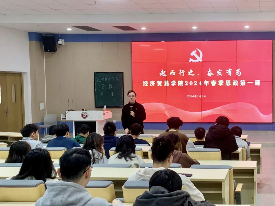 3月8日,经济贸易学院党委副书记宋元跃老师在肇庆校区8号楼109讲授以“起而行之,奋发有为”为主题的思政第一课,2022级、2023级学生共同参加此次课程。