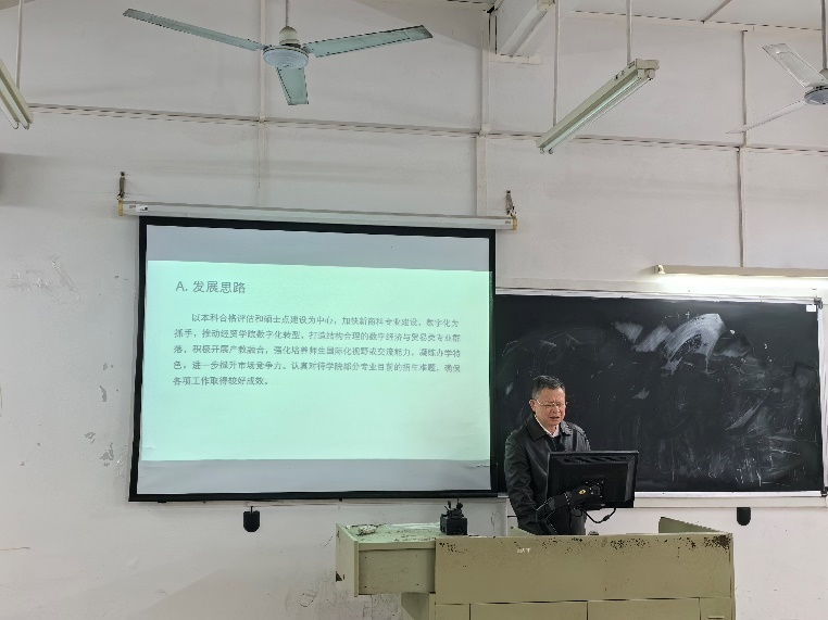 会上,李广明院长首先对学校高质量大会精神的精神进行传达,深入分析学院的发展现状和存在问题,就新学年工作提出发展思路、目标、重点任务和需要采取的举措。李院长提出,学院要以省委对教育界提出的“冲一流、补短板、强特色”要求为指引,加强与产业、社会和市场的联系,精准定位学院的办学方向和特色。针对学院当前面临的招生规模小、教师队伍结构和学术水平待优化等问题,李院长强调了每位教职工的责任,提出通过制度建设达成个体与组织目标协同,形成个人与学校和学院共同发展的共识。在谈到办学定位和特色凝练时,李院长指出,学院要以数字化转型、国际化办学和产教融合为办学载体,逐步凝练出学院的办学特色。他提出,学院应建设成面向数字经济产业与数字贸易领域的数字经济与贸易学院,并建议在条件成熟后报学校申请更名为“数字经贸学院”。