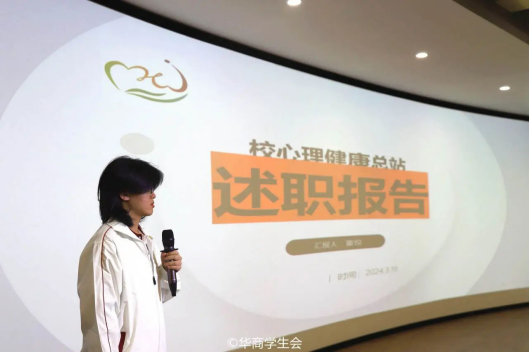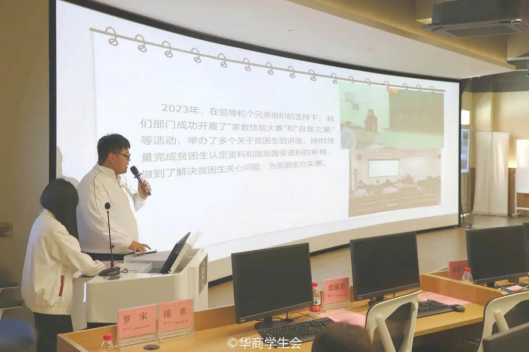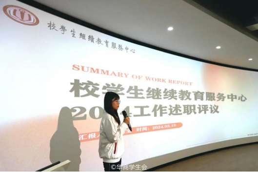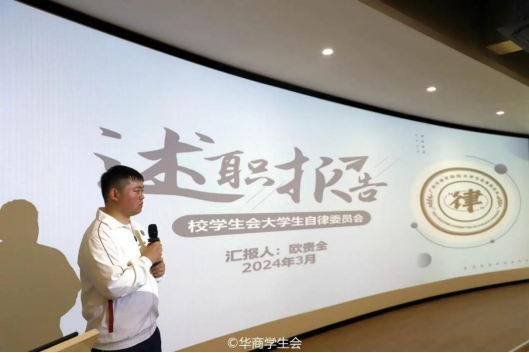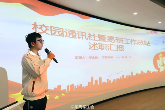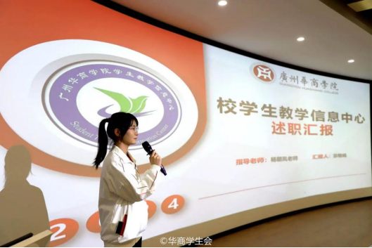 ——教学信息中心。教学信息中心分别从工作回顾、经验总结以及工作计划三个板块展开述职报告。在上一学期,教学信息中心及时了解学生对教学方面的意见,建立学生信息反馈系统,为同学们维护自身权益开辟了新的方式,进一步提高教学质量和学生对学校的认同感,为同学们创造更加便捷、和谐的校园生活。