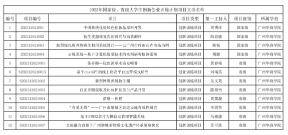 根据《教育部高等教育司关于公布2023年国家级大学生创新训练计划项目和重点支持领域项目名单的通知》(教高司函〔2023〕8号)和《广东省教育厅关于公布2023年大学生创新创业项目立项和结题验收结果的通知》(粤教高函〔2023〕30号),我校共有12个项目获得2023年国家级、省级大学生创新创业训练计划项目立项,其中国家级大学生创新创业训练计划项目4项,省级大学生创新创业训练计划项目8项。