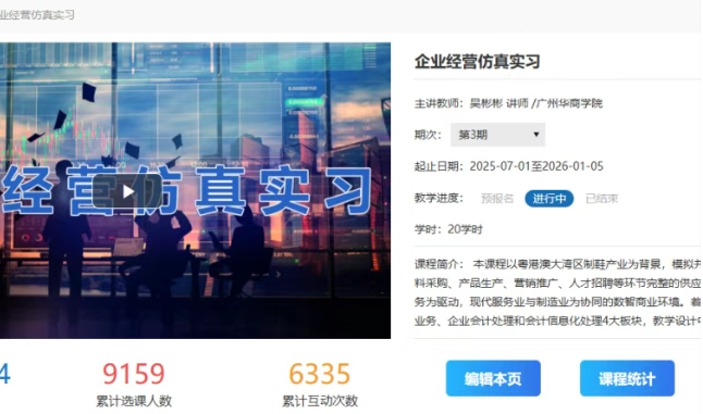《企业经营仿真综合实习》是我校经管类专业的综合实践课,面向会计学、财务管理、审计学、税收学、工商管理、市场营销、物流管理、人力资源管理、国际经济与贸易、国际商务、信息管理与信息系统、经济统计学等13个专业开设,于大四第一学期实施,共4学分、160学时。课程构建虚拟的商务环境、政务环境与公共服务环境,学生通过角色扮演在业务流程情景中了解企业外部经营环境及企业管理决策相关知识,于场景里仿真感知企业间竞争合作关系,在虚拟商务环境中通过团队间竞争和博弈,感悟经营决策,体验市场经济魅力。学生通过学习系统掌握企业基本业务流程与运行规则,全面提升其综合知识运用能力、决策分析能力、数字经济思维、创新创业能力及团队协作素养。注重培养学生的诚信守法意识、职业道德观念、团结协作精神以及经世济民的企业家情怀。