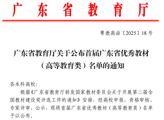 近日,广东省教育厅完成了首届广东省优秀教材(高等教育类)的评选工作,公示期已顺利结束,正式名单尘埃落定。太阳集团tyc4633在此次评选中表现卓越,两部教材成功入选,这无疑是学校教育教学工作的重大成果,彰显了我校在教材建设领域的深厚底蕴与强劲实力。