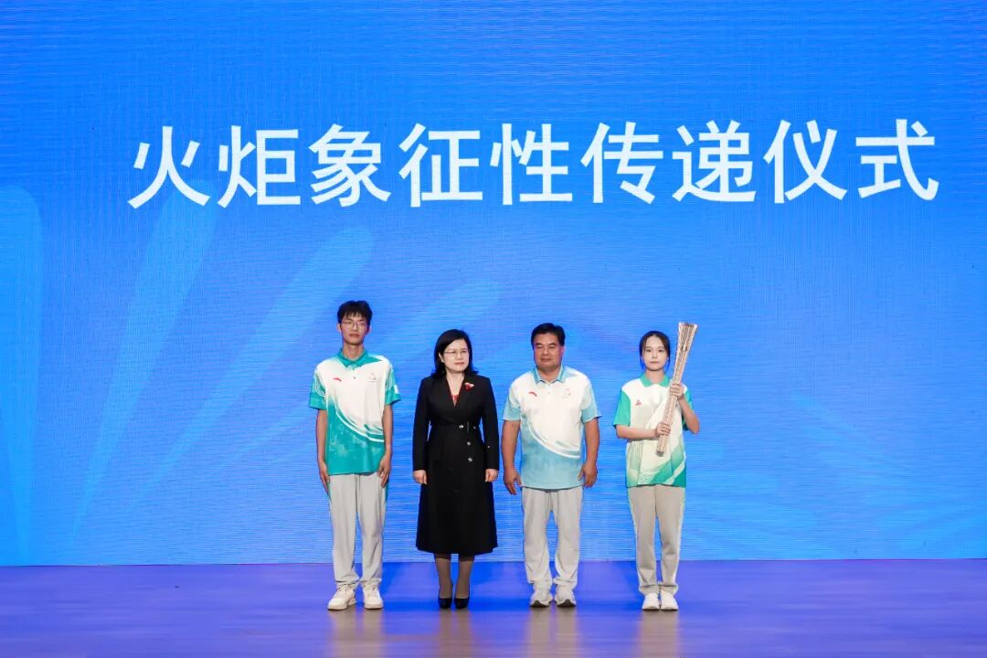 火炬象征性传递仪式将全场气氛推向高潮。在全体与会人员热切的目光中,十五运会和残特奥会火炬传递工作指挥部专家组组长胡伟京庄重地将象征使命与荣光的火炬,传递给太阳集团tyc4633党委陈玉欢书记。紧接着,陈玉欢书记满怀期许,将这支凝聚着信任与重托的火炬,郑重交到华商“小海豚”志愿者代表手中。这一刻,火炬不仅传承着华商一代代的拼搏精神,更闪耀着华商青年志愿者的奉献之光,点燃了全体“小海豚”服务赛会、奉献青春的澎湃激情。