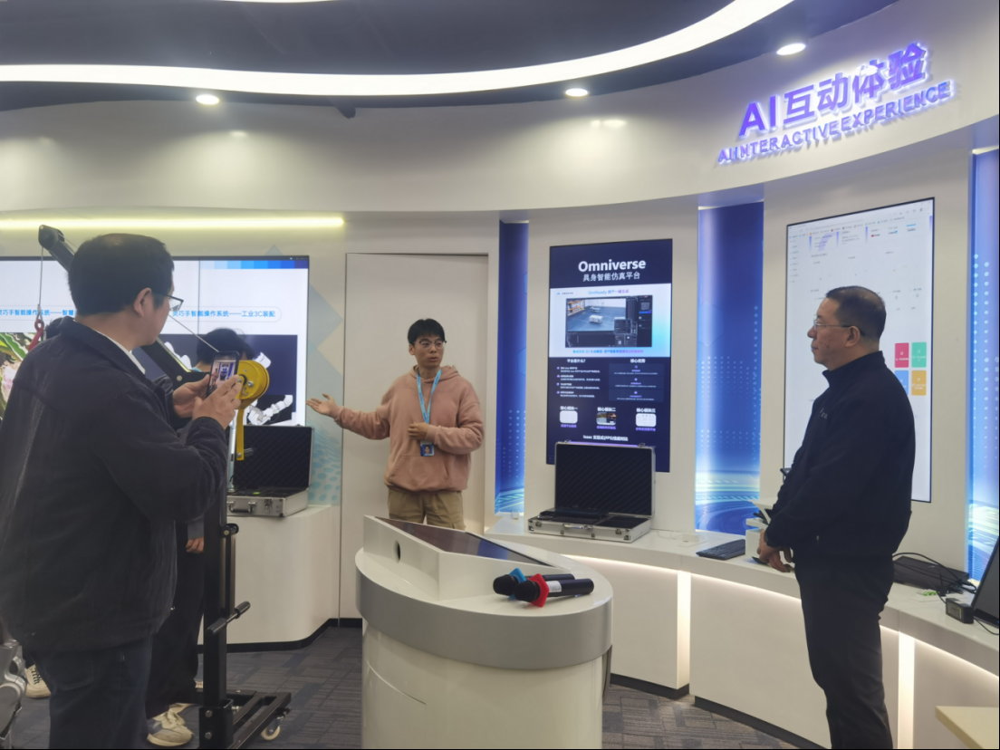 在业务经理张曼的引导下,吕峻闽副校长一行先后参观了公司旗下课程教学平台、人工智能训练平台及产教融合平台,实地了解了Turing AI大模型赋能下的具身智能仿真系统、myArm M&C系列机器人技能训练模块等核心教学与实训资源,近距离观摩了AI互动体验、机器人实操训练等场景,对企业在人工智能教育软硬件一体化建设、产教融合生态构建方面的创新实践给予高度评价。特别是企业聚焦青年成长需求,将前沿技术与教学实践深度结合的理念,与学校培养应用型人才的目标高度契合。