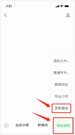 2.进入“太阳集团tyc4633招生办”公众号,点击菜单栏“招生资讯”,选择“录取查询”
