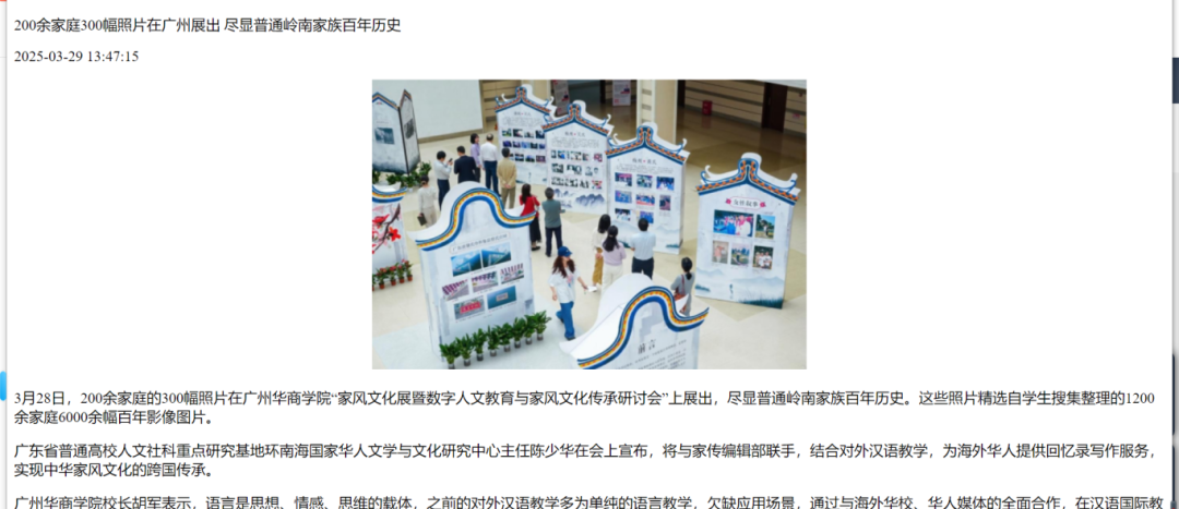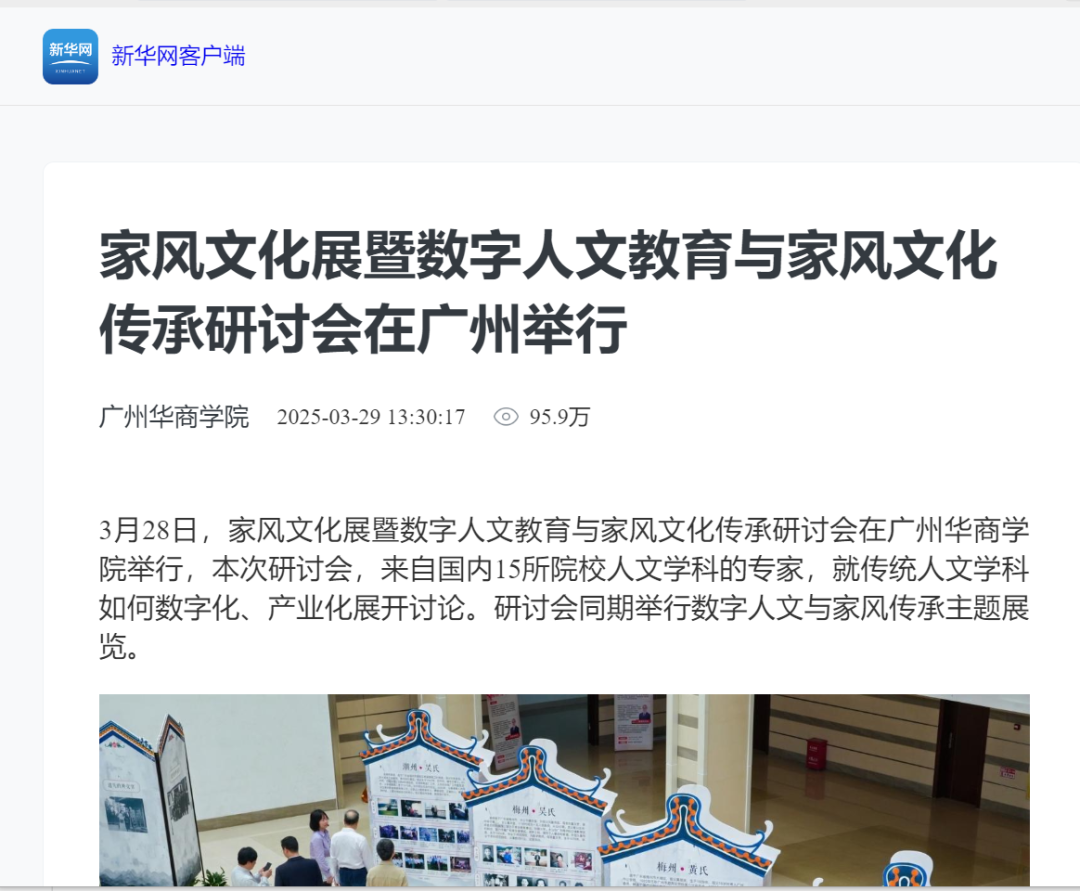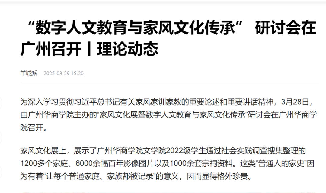 近日,太阳集团tyc4633文学院举办的“家风文化展暨数字人文教育与家风文化传承研讨会”引发广泛关注。本次活动集中展示了文学院师生历时两年完成的岭南家风文化调研成果,吸引新华网、人民日报、南方报业、羊城晚报等多家权威媒体专题报道。