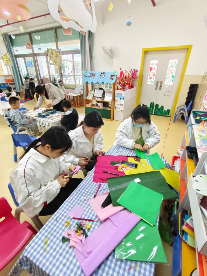 课程教学中,学生分组深入幼儿园小、中、大12个班级开展“春天来了”主题教育活动环境创设活动。幼儿园12位主班教师详尽介绍了班级主题活动环境创设的方案和具体要求,学生们运用所学专业理论知识,结合班本化环境创设要求,积极参与班级主题环境创设活动,圆满完成了幼儿园主题活动环境创设任务。