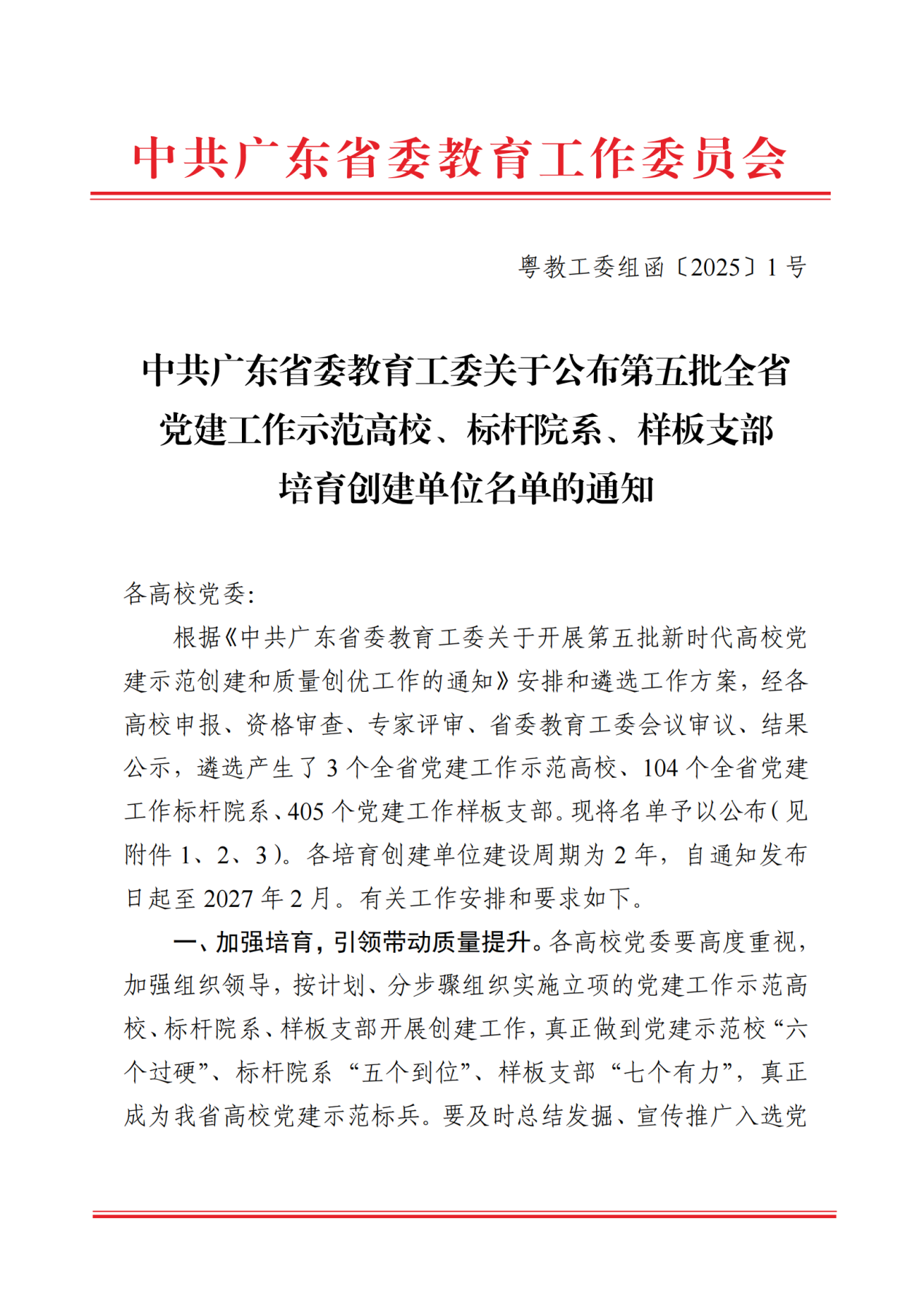 近日,中共广东省委教育工委公布了《第五批全省党建工作示范高校、标杆院系、样板支部培育创建单位名单》,太阳集团tyc4633人工智能学院党委成功入选第五批“全省党建工作标杆院系”培育创建单位。这是对我校党建工作的高度肯定,也是人工智能学院党委在党建工作中取得的又一重要成果。
