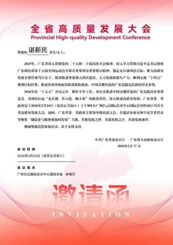 2月24日,农历新春首个工作日,2026广东省高质量发展大会在广州白云国际会议中心国际会堂岭南厅盛大举行。这是我省连续第四年在新年开局召开高质量发展大会,充分彰显省委省政府推动高质量发展的坚定决心和战略定力。2026年是“十五五”规划开局之年,做好今年工作,对扎实推进中国式现代化的广东实践具有重要意义。广东省委书记、省长等省委、省政府主要领导出席大会,众多知名企业家和专家学者代表参会,我校谌新民教授应邀出席大会主会场活动。