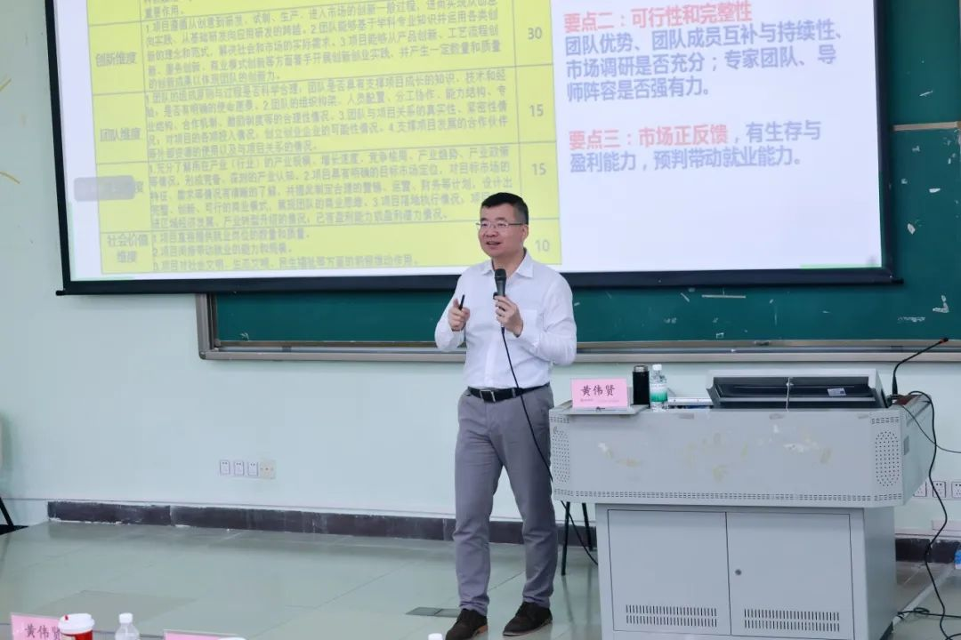 培训伊始,黄伟贤副教授首先对大赛的战略定位、政策导向及赛制创新进行了系统解读。他强调,创新创业教育作为国家产教融合战略的重要实践载体,其核心在于培养具有创新思维与实战能力的复合型人才,而大赛正是检验育人成效、对接产业需求的关键平台。