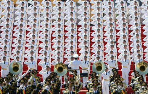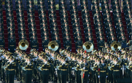 军乐团、合唱团奏唱歌曲。这个是中国阅兵史上的第一次,世界上目前也无其他国家同时组织这么多男性军人在阅兵时一起合唱。