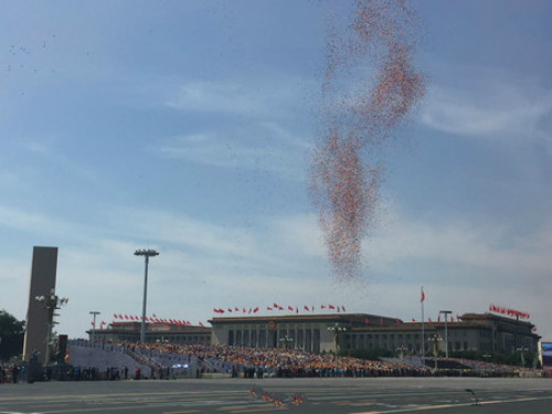 7万羽和平鸽展翅高飞,7万只气球腾空而起。这是中华民族对世界和平最美好的祝愿。胜利属于伟大的中国人民,胜利属于全世界爱好和平与正义的人们。习近平等向城楼下的中外来宾和各界群众挥手致意。大会在《歌唱祖国》的激昂乐曲中圆满结束。