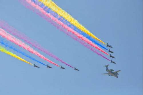 空中护旗方队,悬挂中华人民共和国国旗和中国人民解放军军旗;六架直升机护卫国旗、军旗,20架直升机组成“70”字样,7架飞机拉出7道彩带,寓意着中华民族迎来了抗战胜利暨世界反法西斯战争胜利70周年,正在走向中华民族伟大复兴的新征程。气贯长虹,开创未来!