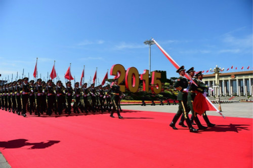 习近平发表重要讲话。其主要阐释一个目的:铭记历史、缅怀先烈、珍爱和平、开创未来;强调一个作用:中国人民支撑起世界反法西斯战争的东方主战场;指出一条道路:树立人类命运共同体意识,坚持走和平发展道路;宣布一个决定:中国将裁减军队员额30万。