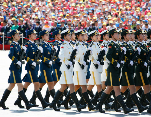 徒步方队陆海空三军仪仗队接受检阅,女兵首亮相。