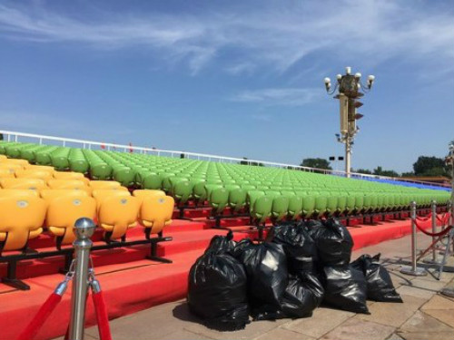 观礼台嘉宾撤离后,现场干净整洁,垃圾都收在塑料袋中。为这样的国人骄傲!为这样的祖国自豪!