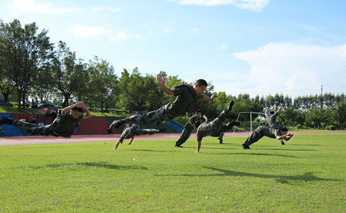 最后,承训部队的教官表演了军事节目。教官们依次表演了军体拳,近身格斗术等一系列节目。教官精彩的表演赢得了新生一阵又一阵的欢呼。随着表演的结束,邓基泽副院长宣布,本次学生军训动员大会正式结束。接下来,新生将要经历为时两周的军事训练。