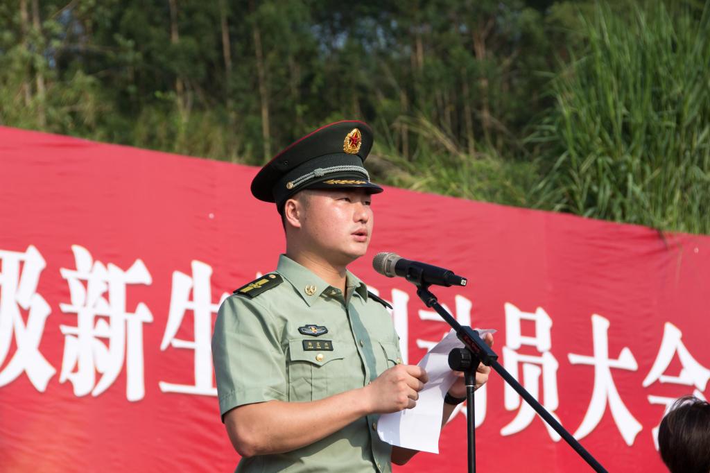 军训团郑宏兴团长在致辞中讲到,军训是培养广大学生增强爱国意识和国防意识的重要途径,同时也为我国国防后备力量做好充分的准备。为我校军训任务取得圆满成功,郑宏兴团长对各位首长教官提出几点严格的要求:一,严格按照学校要求,紧密结合学校的规章制度和学生的身体实际,切实做到劳逸结合,循序渐进。二,文明实训。军训过程中,不仅要把军训技能教给新生们,更重要的是要把部队的优良传统展现给同学们,成为新生们的良师益友。三,谦虚好学,向学校领导学习,向在校的师兄师姐们学习。军训中要多与老师,同学加强交流,积极配合学院领导以及辅导员的工作。同时,郑宏兴团长也对接受军训的新生提出了两点要求:一,敢于吃苦敢于锻炼,在军训中要勇于激发自己的斗志,磨砺自己的意志。二,希望新生们服从命令,听从指挥。