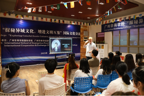 本次分享会邀请了来自英国苏格兰的外教Colin Derek Black担任主讲嘉宾, 他从苏格兰与英国的关系、苏格兰历史上的著名人物、苏格兰的人文风俗、苏格兰特色美食等角度为现场师生带来了一场沉浸式的苏格兰文化体验。
