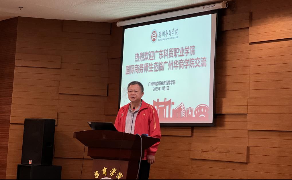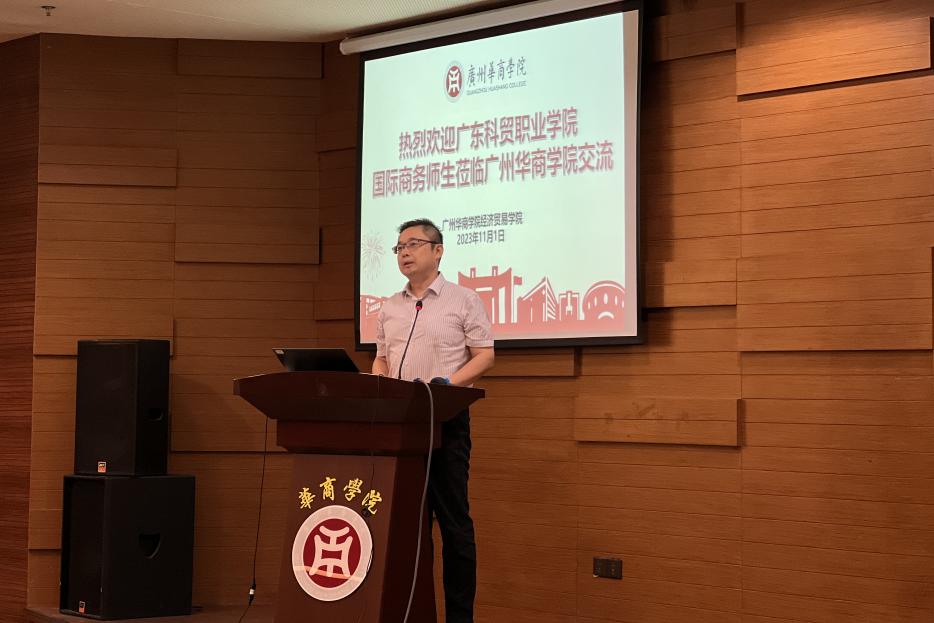 广东科贸职业学院商贸学院关善勇院长致辞。关善勇院长首先对华商经贸学院师生的热情接待表达了感谢,并介绍了广东科贸职业学院及其商贸学院的发展、校区设置、专业设置,教学成果等方面的具体情况。特别是在学院建设中提出着力于四个提升:专业特色提升、课堂教学水平的提升、产教融合水平的提升以及社会服务方面的提升。