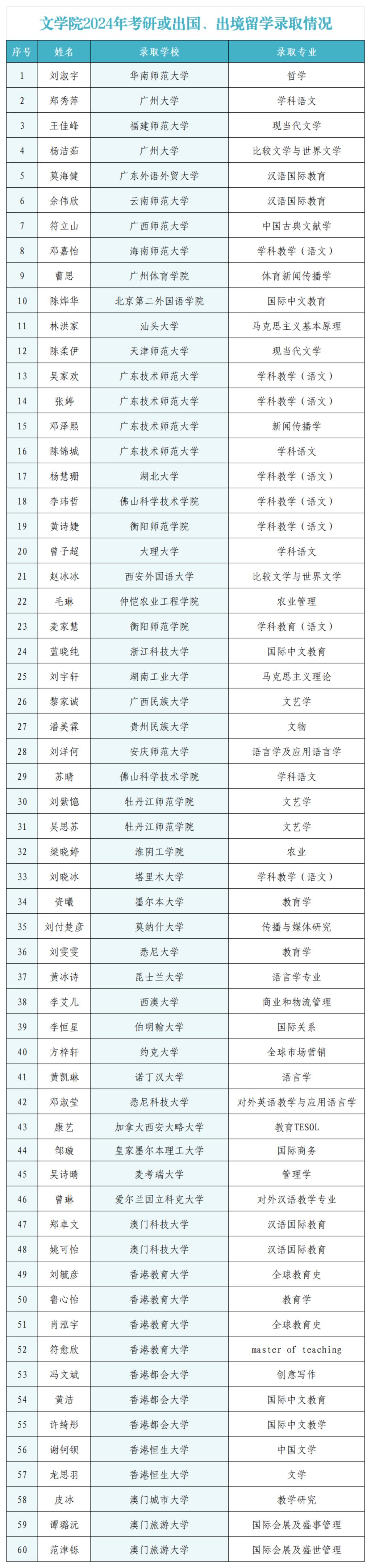 辛勤耕耘有矢志,硕果飘香又一年。近日,文学院学生在2024年全国硕士研究生考试中捷报频传,考研成绩喜人,再创历史新高。文学院共有60名同学脱颖而出,以优异的成绩被华南师范大学、广州大学、广东外语外贸大学、广西师范大学、悉尼大学、昆士兰大学等国内外知名高校录取。