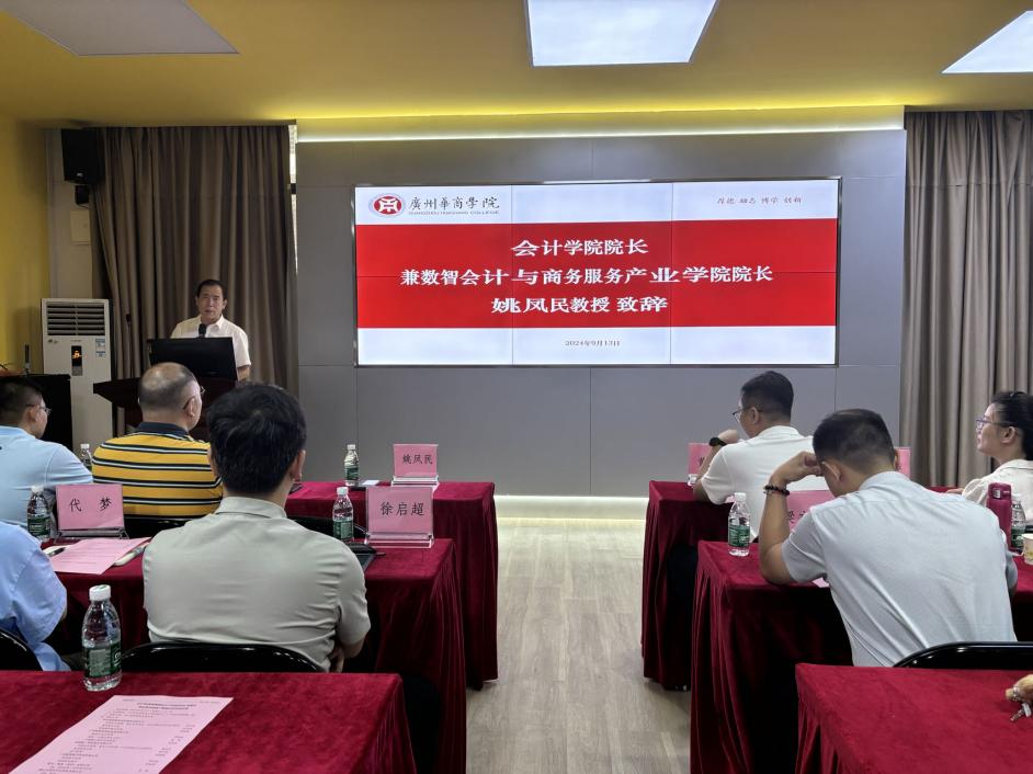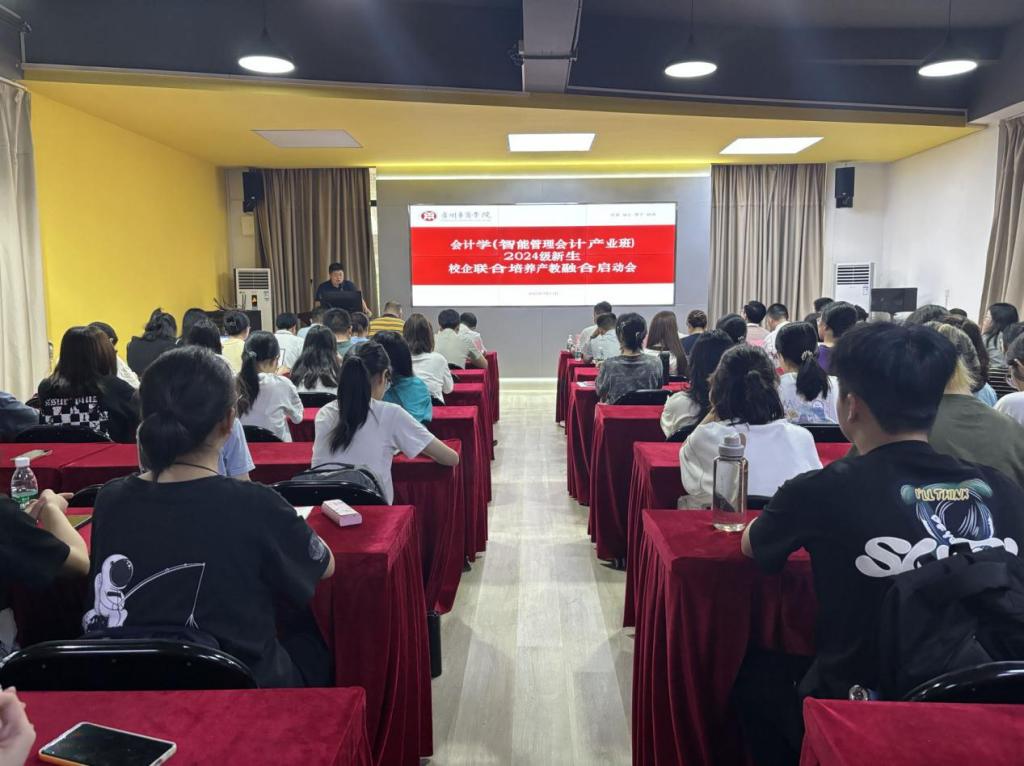 2024年9月13日,太阳集团tyc4633会计学(智能管理会计产业班)2024级校企联合培养产教融合启动会在会计学院会议厅举行,与会计学院产业学院联合培养人才的用友新道科技股份有限公司、广州恒惟信科技集团有限公司、金蝶精一科技服务有限公司、广东翰智数字科技有限公司、零禾一智能(深圳)有限公司、湛江市明灯文化科技有限公司的企业代表,学校教务处副处长黄静萍老师、会计学院院领导、产业学院院领导等出席典礼。典礼由会计学院副院长周书域老师主持。