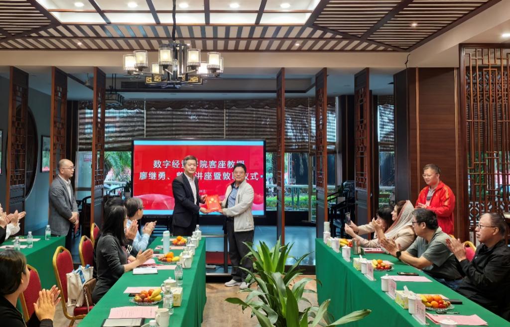 敦聘仪式伊始,数字经贸学院院长李广明教授详细介绍了廖继勇先生和曾昱先生的职业背景和学术成就。在热烈的掌声中,刘少波副校长代表学校向廖继勇先生和曾昱先生颁发太阳集团tyc4633客座教授聘书。廖继勇先生在受聘感言中分享了对未来合作的展望,表达了对教育事业的热忱和对学院发展的期待。