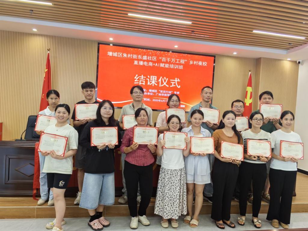2025年6月7日,由数字经贸学院电子商务系姚仙丽老师授课的朱村街“百千万工程”乡村夜校——东盛社区直播电商+AI赋能培训班,在学员们的实战演练与收获喜悦中圆满结课。此次培训不仅为“百千万工程”和乡村振兴注入新动能,更是学院践行社会责任的有力见证。