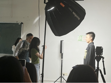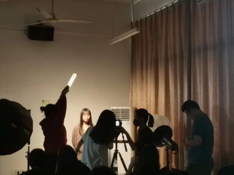 工作坊讲座的实训环节,王灏总监讲解到抖音起号十大技巧的最后一点——做氛围感时,用专业设备实践如何拍摄出一条氛围感的抖音短视频,传播与传媒学院教师赵安琪老师与博沃公司摄影师辅助王灏总监手把手教学学生如何打光与环境布置,同学们积极踊跃地担任摄影主角和上手拍摄中。
