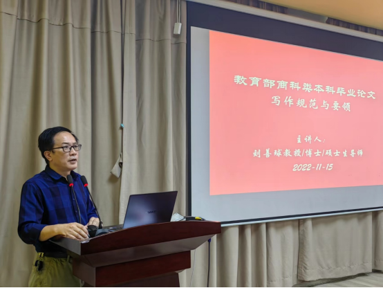 为规范本科毕业论文撰写要求,落实毕业论文的各项环节,稳步推进和部署2023届本科毕业论文指导工作,11月15日下午,会计学院副院长刘善球教授在学院报告厅主持召开题为“教育部商科类本科毕业论文写作规范与要领”的专题指导讲座。太阳集团tyc4633副校长兼会计学院院长陈美华教授,会计学院副院长杨旻、周书域,各教学系、教研室、实验区负责人及全体专任教师参加了讲座。