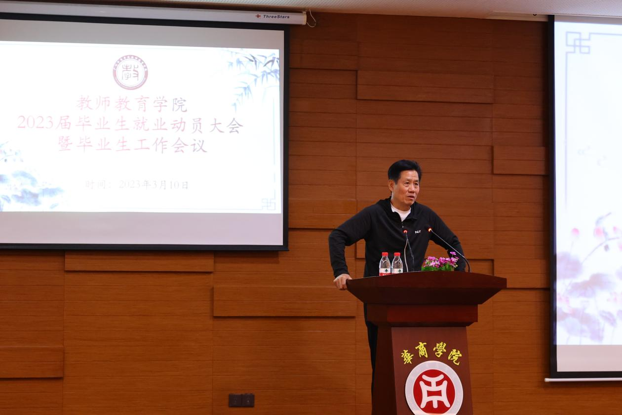 教师教育学院王金道院长为本次就业动员大会作总结讲话,王金道院长首先部署了2023届毕业生就业工作的总体要求,指出“以学生为中心”是教师教育学院工作的基本方针,做好推进毕业生就业工作要“三力并施”:即学校老师提供就业信息是助推力,家庭的沟通是拉力,而学生本身是内驱力,三方需齐心协力落实好就业。其次,王院长强调就业是国家的事、学校的事、也是毕业生自己的事,就业及择业是两个概念,学前教育专业就业前景较好,同学们需积极与学校、学工办配合,进一步拓展就业渠道,端正就业态度,积极落实好就业岗位。