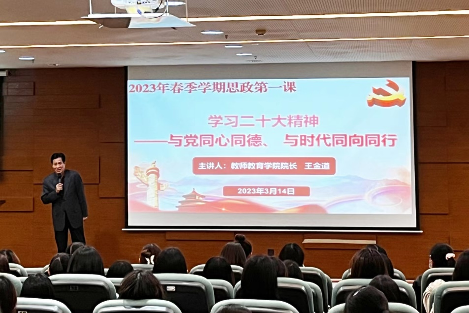 为全面贯彻党的教育方针,贯彻落实教育部十部门《全面推进“大思政课”建设的工作方案》文件精神,加强学院思政课建设,充分发挥思政课在立德树人中的关键作用。教师教育学院开展2023年春季学期“思政第一课”,旨在帮助学生进一步提高思想觉悟,贯彻落实党的二十大精神,增强同学们的爱国、爱党情怀。
