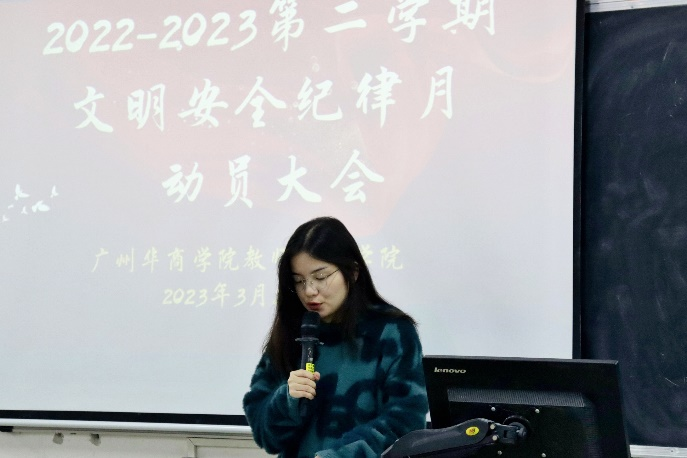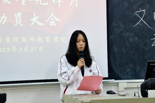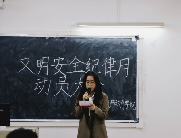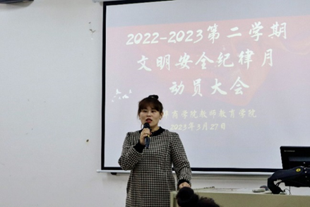 会议伊始,许娜老师从工作部署、宣传动员、检查落实、总结表彰四个方面,向与会人员简述本次动员大会的总体安排,并呼吁要充分发挥党员、团员、学生干部在文明安全纪律教育活动中的“传-帮-带”的作用,从而提高广大学生的安全意识和遵守学校各项规章制度的自觉性。同时指出,将由辅导员带领教师教育学院全体学生,积极开展班级、个人自查,反思总结个人文明纪律问题。
