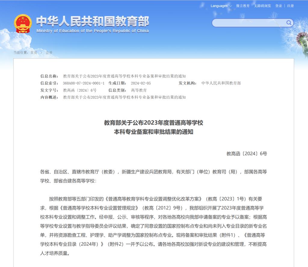 日前,教育部公布了2023年度普通高等学校本科专业备案和审批结果,共新增备案专业点1456个、审批专业点217个(包括160个国家控制布点专业和57个目录外新专业),调整学位授予门类或修业年限专业点46个。本次备案、审批和调整的专业,将列入相关高校2024年本科招生计划。