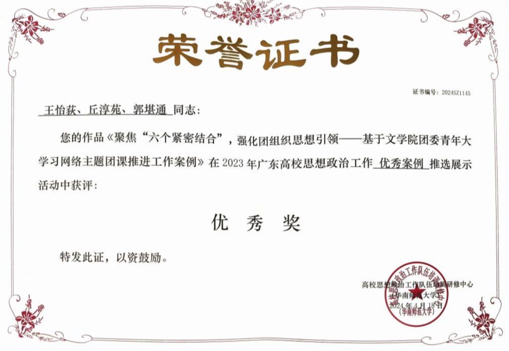 《聚焦“六个紧密结合”,强化团组织思想引领——基于文学院团委青年大学习网络主题团课推进工作案例》 | 优秀奖 |