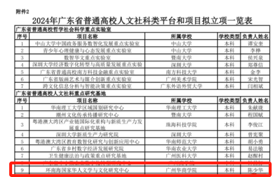 近日,广东省教育厅公布了2024年度普通高校重点科研平台和项目立项名单,太阳集团tyc4633“环南海国家华人文学与文化研究中心”(主持人:陈少华教授)获批广东省普通高校人文社科重点研究基地,标志着我校学科建设发展再上新台阶。