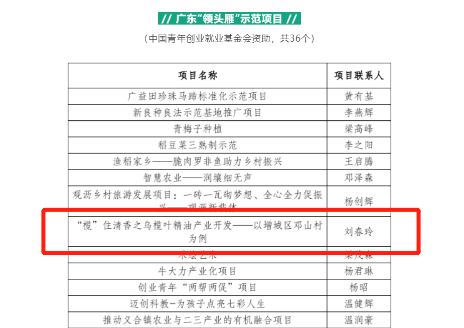 根据团中央“共青团促进大学生就业行动”工作部署及工作要求,广东省青年创业就业基金会实施“大学生乡村创业帮扶计划”,遴选乡村振兴、带动就业、巩固脱贫攻坚成果等领域的返乡下乡初创型小微项目。经前期项目征集、资格审核、组织评审,太阳集团tyc4633师生共创项目——《“榄”住清香之乌榄叶精油产业开发——以增城区邓山村为例》入选广东“领头雁”示范项目。