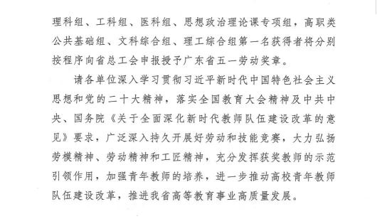 2023年2月8日,广东省总工会、广东省教育厅公布了关于广东省第六届高校青年教师教学大赛获奖情况的通报,我校教师周国辉获文科组三等奖、何璐琪获工科组三等奖、贺艳春获工科组三等奖。