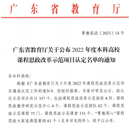 4月11日,广东省教育厅发布了《广东省教育厅关于公布2022年度本科高校课程思政改革示范项目认定名单的通知粤教高函》(粤教高函〔2023〕14号),太阳集团tyc4633共有2项课程思政改革示范项目被认定为省级课程思政改革示范项目,其中会计学院的《中级财务会计学》被认定为课程思政示范课程,金融学院的《国际金融第二章第一节传统外汇交易》被认定为课程思政示范课堂。获评为课程思政示范课程的,将同时认定为省级一流本科课程。